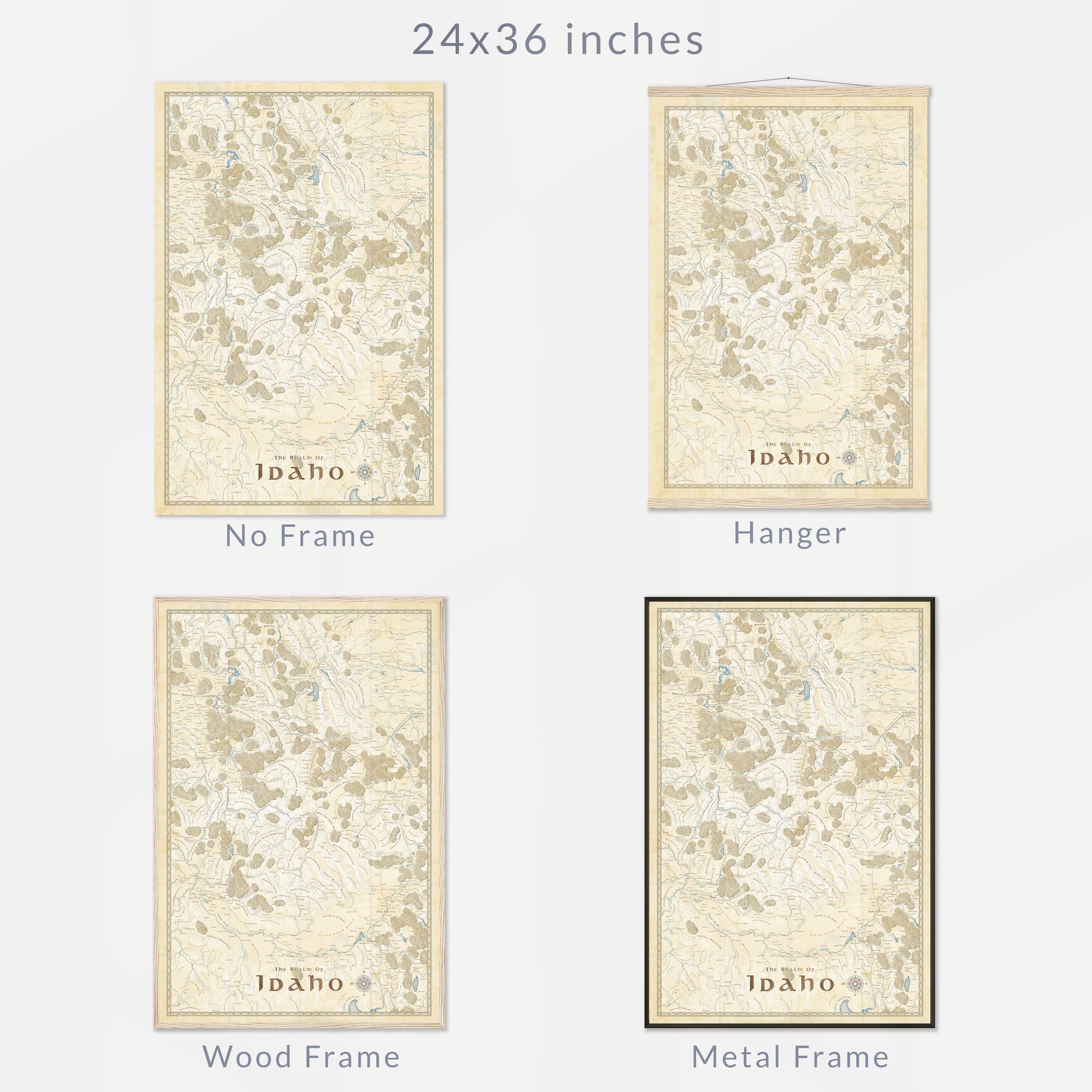 - Frame options: None (print only), Hanger (pine), Wood (pine), Metal (aluminum)